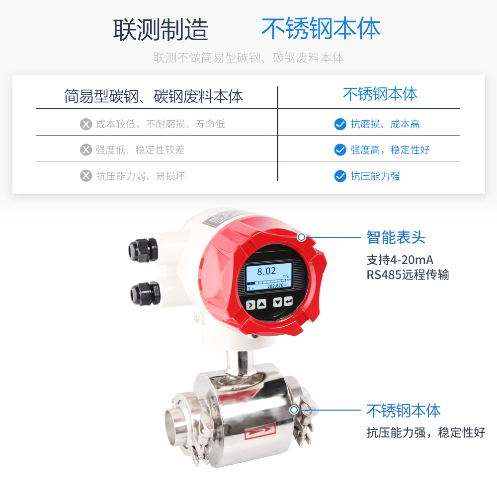 聯(lián)測LDG-SINW衛(wèi)生型電磁流量計廣泛應用于食品,醫(yī)藥等衛(wèi)生型行業(yè)及溫泉、飲料等領域的流量計量。多用于現(xiàn)場工況或者介質要求衛(wèi)生類型。