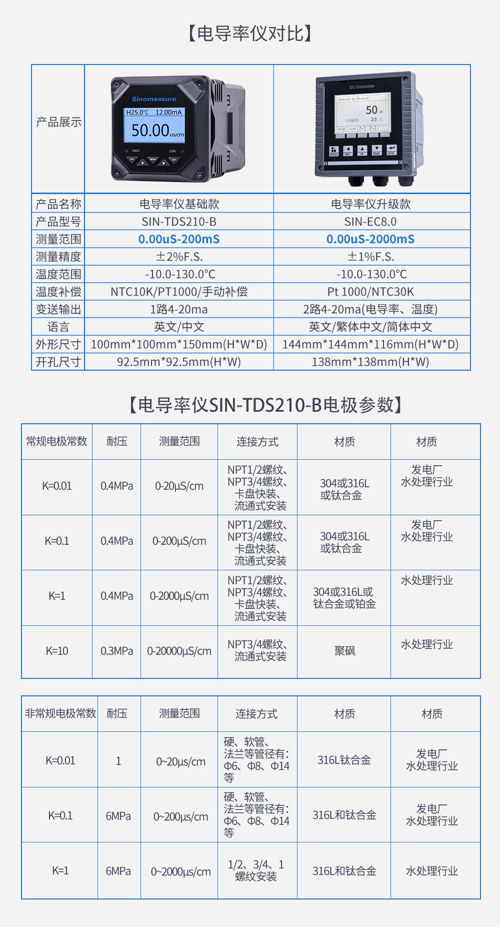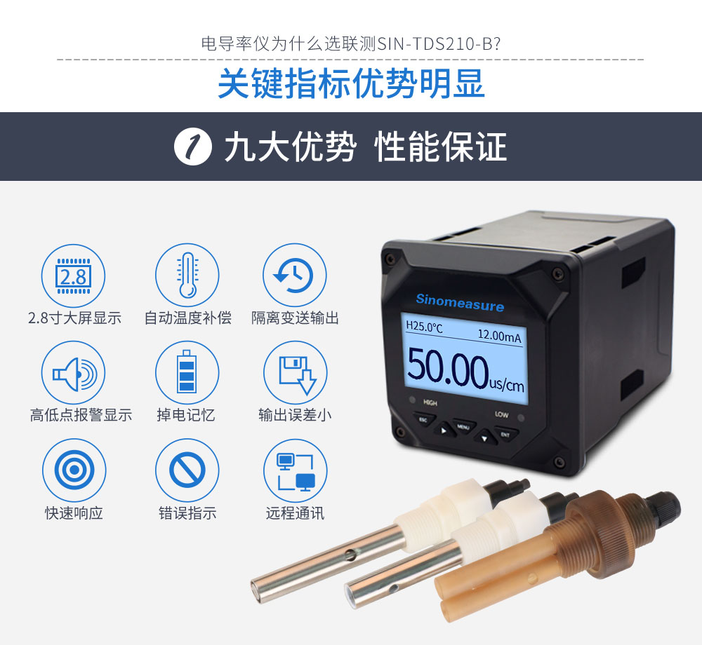 SIN-TDS210工業電導率儀表,可對各種工業用水的電導率(TDS)值進行連續測量和控制,本裝置廣泛應用于科學實驗裝備、化工、制藥、環保、冶金、造紙、食品、飲料及供水等行業。根據水工業的環境和特點結合國際供電標準,考慮了特殊環境的電氣設計規范,增加了220VAC供電。