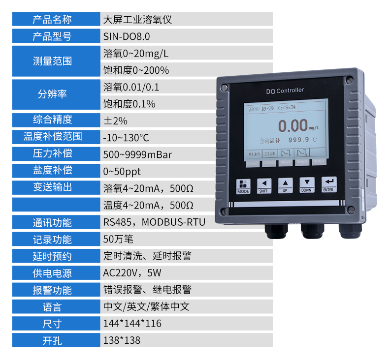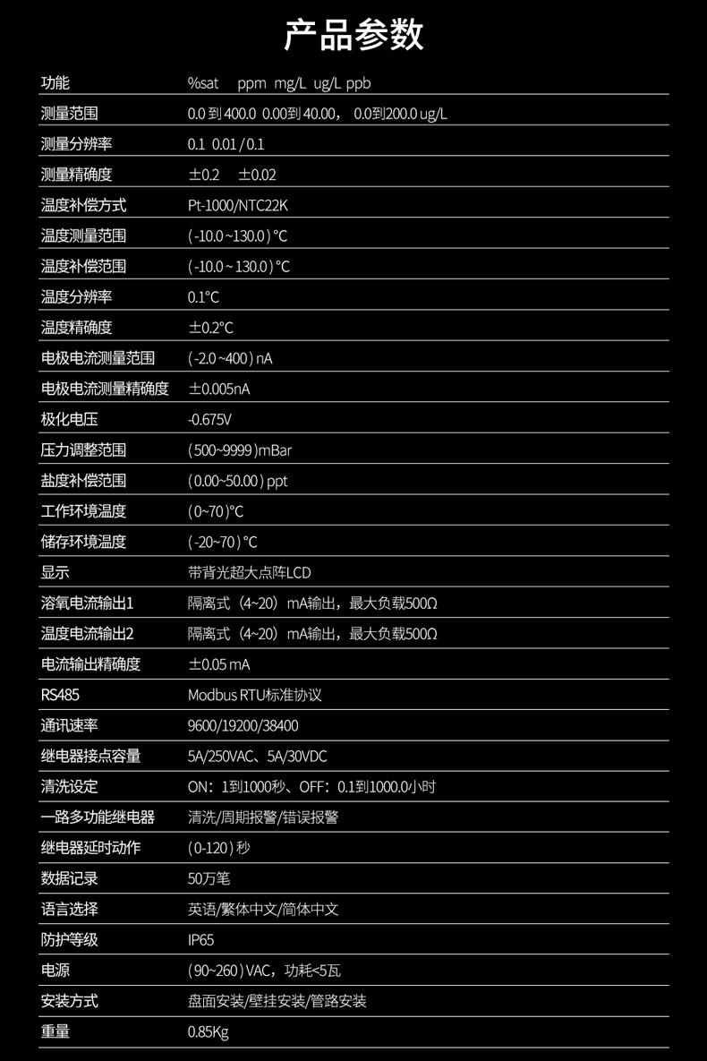 儀器用于工業(yè)上溶氧%/ppm/mgL/ugL/ppb 及溫度的測量,如:發(fā)酵,飲用水,鍋爐水,海水,養(yǎng)殖,水族館,地表水,工業(yè)污水,都市廢水,環(huán)境監(jiān)測,食品生產(chǎn)過程等,儀器可以盤面安裝,壁掛安裝,管路安裝,儀器提供 2 路電流輸出,最大負(fù)載為 500Ω,儀器提供 3 路控制用繼電器,繼電器最大承受電壓及電流為 5A/250VAC 或 5A/30VDC。