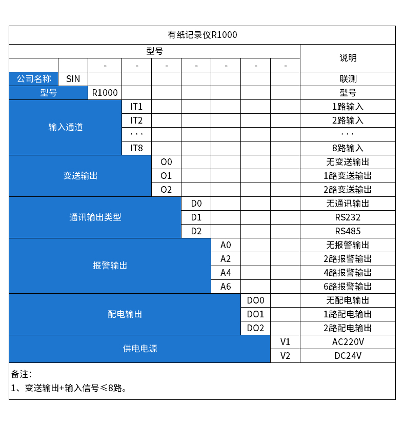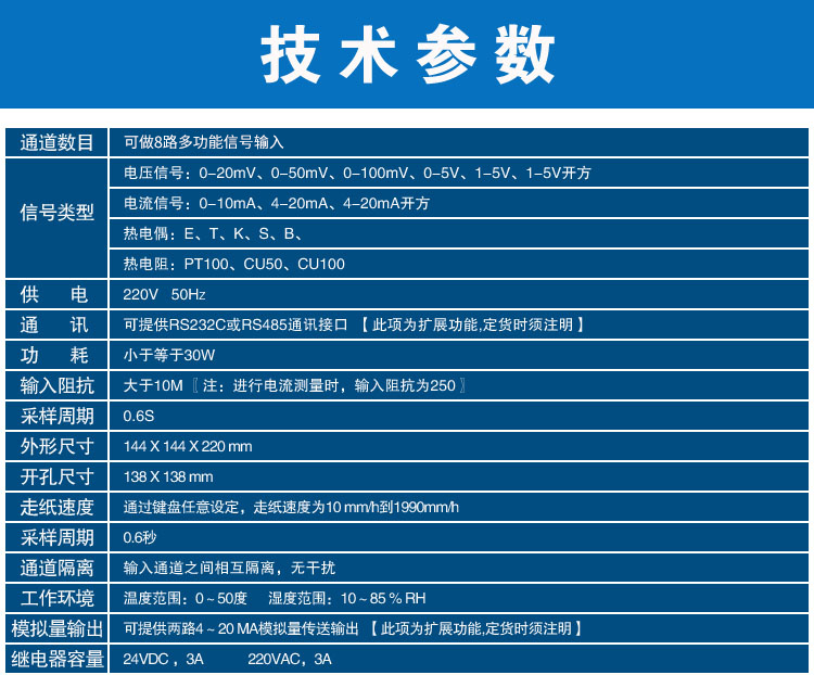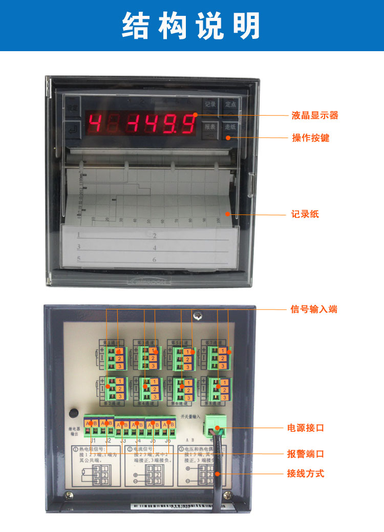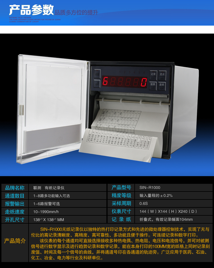 SIN-R1000有紙溫度記錄儀最多具有8路輸入通道,2路模擬量輸出,通道之間采用點點隔離;均可直接選擇接收多種熱電偶、熱電阻、壓力變送器、電壓、電流信號,并可對被測信號進行數字顯示及進行趨勢記錄和數字記錄,能在本身打印的120mm寬的紙格上同時記錄刻度值、時間及每一個信號的曲線,并將通道號印在各通道的軌跡旁。