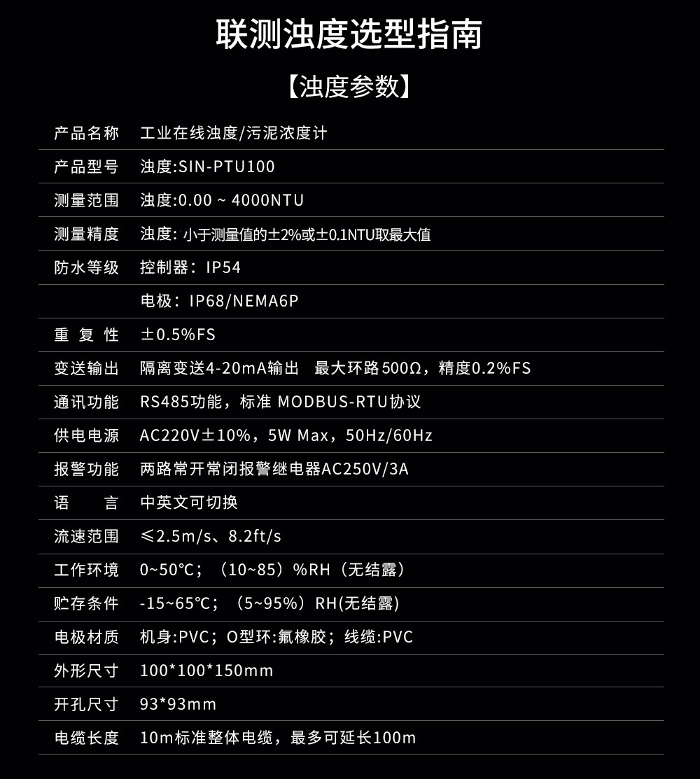 聯測SIN-PTU100在線濁度分析儀內置微處理器,適用于于污水廠、自來水廠、水站、地表水、工業等領域濁度監測,例如:污水廠沉淀池、造紙漿液池、提升泵站、氧化溝濁度測量等。